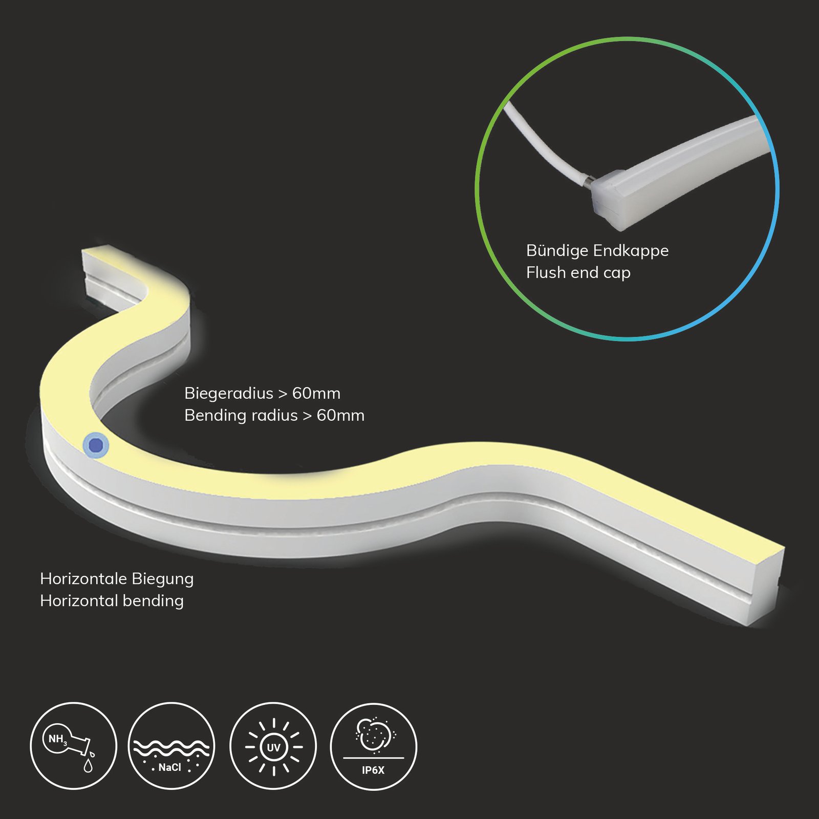 Trennstelle: 50mm mit je 12 SMD | Pitch (Lichtpunkt Mitte-Mitte): 8,34mm | max. Flexbandlänge pro Einspeisung: 5m | Längentoleranz + Wärmeausdehnung: 1% | kein Kühlprofil erforderlich | ohne Klebeband! | Silikon Verguss | BESONDERHEIT: 30cm 3-pol. Mantelleitung beidseitig, weiß, Anschluß stirnseitig, offene Litze | HINWEIS: in der Breite und Höhe bündige Endkappen, horizontal biegbar (Biegeradius min. 60mm) | Schwer entflammbar und flammwidrig (IEC 60695-11-5), IK08 (IEC 62262), salzsprühbeständig (IEC 60068-2-11:2021), UV-beständig (ASTM G154-2016)