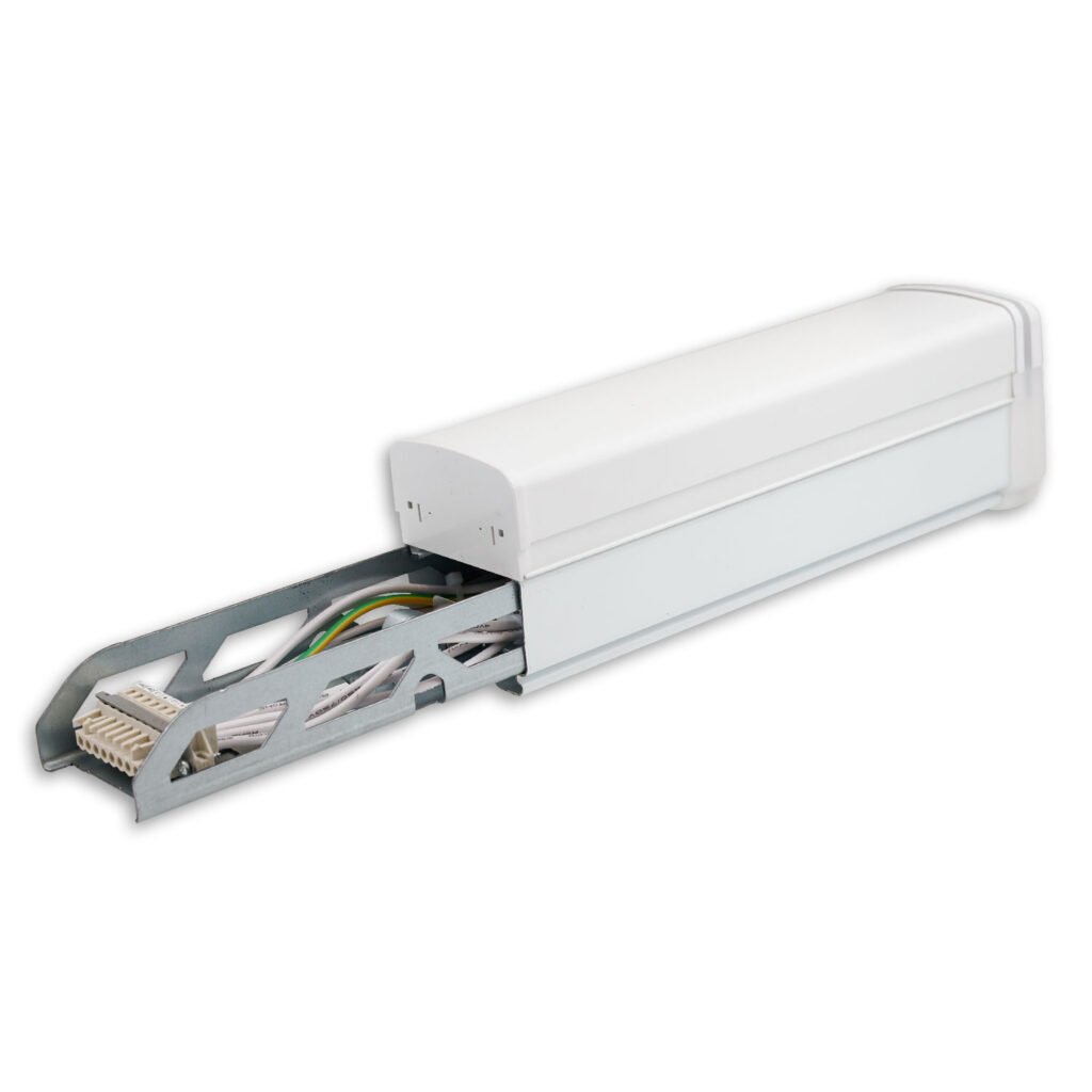 Dieses Linear LED Lichtsystem ist für den Innenbereich geeignet und wurde von TÜV Süd geprüft. Es eignet sich auch für feuergefährdete Betriebsstätten, ist stoßfest und schlagfest und hat einen fixen Abstrahlwinkel von 60°. Das Licht ist dimmbar via DALI und hat eine Farbtemperatur von 4000 Kelvin. Das Gehäuse ist in weiß gehalten und aus Aluminium gefertigt. Es ist zudem geschützt gegen das Eindringen von Insekten und Spritzwasser. Mit einer hocheffizienten Lichtleistung von 140 Lumen pro Watt und einer Nu
