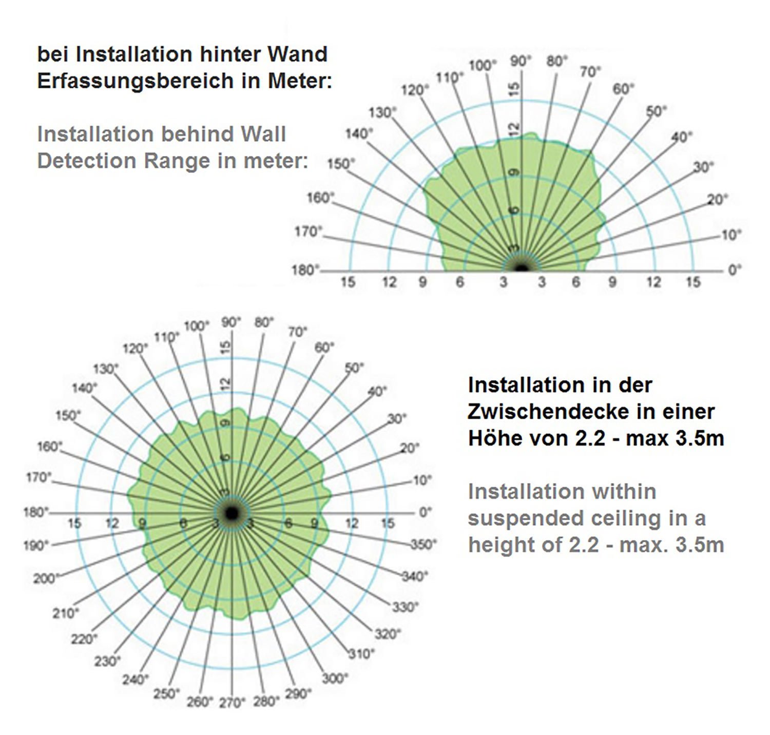 5.8GHz Radar, Schaltleistung max. 300W (bei kapazitiven Lasten wie z.B. LED-Driver), inkl. LUX-Sensor, Erfassungsradius 1-8 Meter einstellbar, Montagehöhe max. 3.5 Meter, Stromaufnahme Standby 0.9W, einstellbare Schaltzeit 10s – 30min