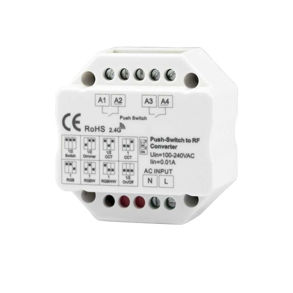 einlernbar auf bis zu 10 Sys-Pro Fernbedienungen, Mesh-Transceiver – gibt das Signal zum nächsten Receiver max. 30 Meter weiter, PWM Frequenz 500Hz. Installation und Anschluss ausschließlich Spannungsfrei durchführen!